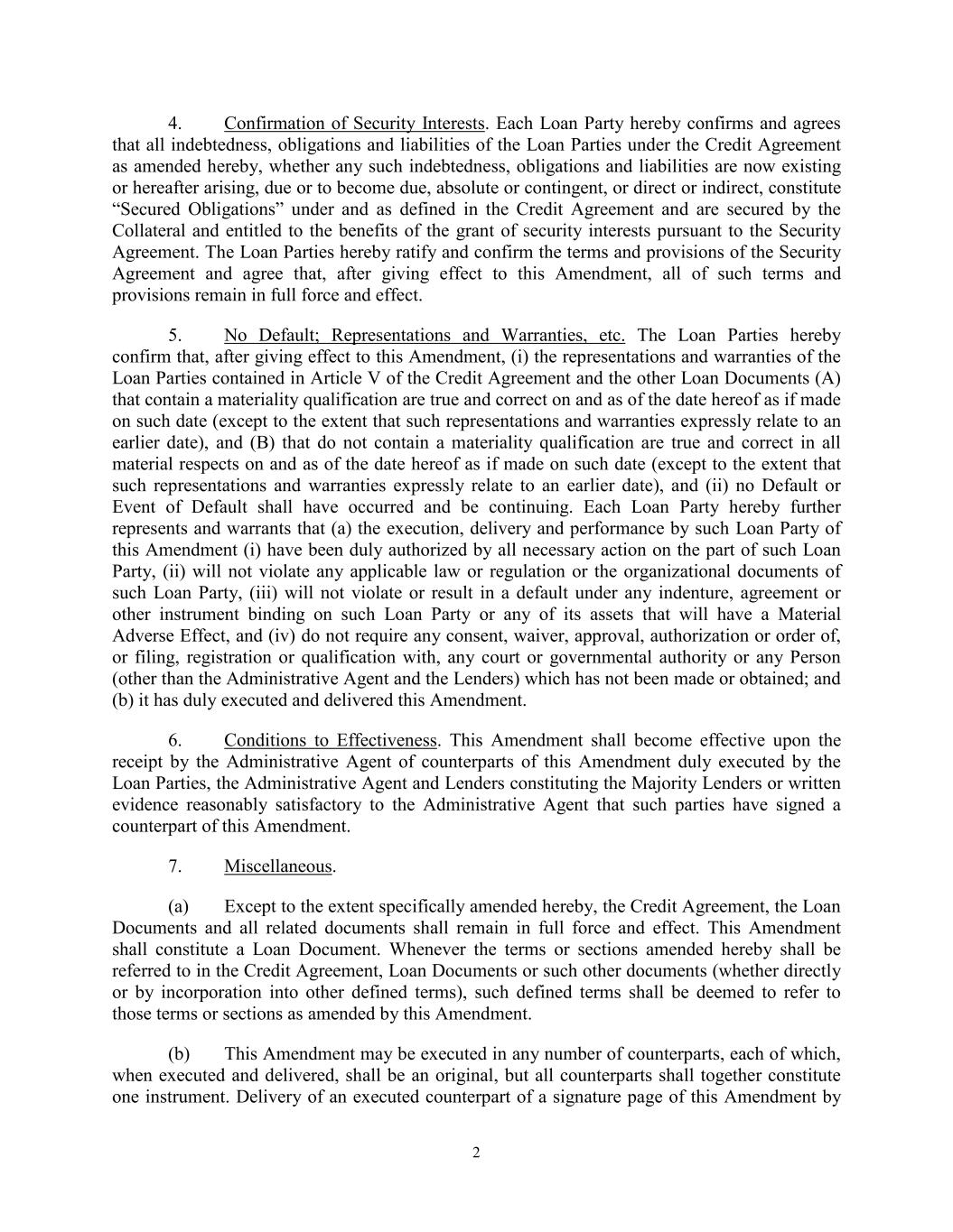 2 4. Confirmation of Security Interests. Each Loan Party hereby confirms and agrees that all indebtedness, obligations and liabilities of the Loan Parties under the Credit Agreement as amended hereby, whether any such indebtedness, obligations and liabilities are now existing or hereafter arising, due or to become due, absolute or contingent, or direct or indirect, constitute “Secured Obligations” under and as defined in the Credit Agreement and are secured by the Collateral and entitled to the benefits of the grant of security interests pursuant to the Security Agreement. The Loan Parties hereby ratify and confirm the terms and provisions of the Security Agreement and agree that, after giving effect to this Amendment, all of such terms and provisions remain in full force and effect. 5. No Default; Representations and Warranties, etc. The Loan Parties hereby confirm that, after giving effect to this Amendment, (i) the representations and warranties of the Loan Parties contained in Article V of the Credit Agreement and the other Loan Documents (A) that contain a materiality qualification are true and correct on and as of the date hereof as if made on such date (except to the extent that such representations and warranties expressly relate to an earlier date), and (B) that do not contain a materiality qualification are true and correct in all material respects on and as of the date hereof as if made on such date (except to the extent that such representations and warranties expressly relate to an earlier date), and (ii) no Default or Event of Default shall have occurred and be continuing. Each Loan Party hereby further represents and warrants that (a) the execution, delivery and performance by such Loan Party of this Amendment (i) have been duly authorized by all necessary action on the part of such Loan Party, (ii) will not violate any applicable law or regulation or the organizational documents of such Loan Party, (iii) will not violate or result in a default under any indenture, agreement or other instrument binding on such Loan Party or any of its assets that will have a Material Adverse Effect, and (iv) do not require any consent, waiver, approval, authorization or order of, or filing, registration or qualification with, any court or governmental authority or any Person (other than the Administrative Agent and the Lenders) which has not been made or obtained; and (b) it has duly executed and delivered this Amendment. 6. Conditions to Effectiveness. This Amendment shall become effective upon the receipt by the Administrative Agent of counterparts of this Amendment duly executed by the Loan Parties, the Administrative Agent and Lenders constituting the Majority Lenders or written evidence reasonably satisfactory to the Administrative Agent that such parties have signed a counterpart of this Amendment. 7. Miscellaneous. (a) Except to the extent specifically amended hereby, the Credit Agreement, the Loan Documents and all related documents shall remain in full force and effect. This Amendment shall constitute a Loan Document. Whenever the terms or sections amended hereby shall be referred to in the Credit Agreement, Loan Documents or such other documents (whether directly or by incorporation into other defined terms), such defined terms shall be deemed to refer to those terms or sections as amended by this Amendment. (b) This Amendment may be executed in any number of counterparts, each of which, when executed and delivered, shall be an original, but all counterparts shall together constitute one instrument. Delivery of an executed counterpart of a signature page of this Amendment by