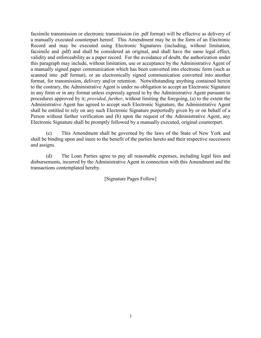 3 facsimile transmission or electronic transmission (in .pdf format) will be effective as delivery of a manually executed counterpart hereof. This Amendment may be in the form of an Electronic Record and may be executed using Electronic Signatures (including, without limitation, facsimile and .pdf) and shall be considered an original, and shall have the same legal effect, validity and enforceability as a paper record. For the avoidance of doubt, the authorization under this paragraph may include, without limitation, use or acceptance by the Administrative Agent of a manually signed paper communication which has been converted into electronic form (such as scanned into .pdf format), or an electronically signed communication converted into another format, for transmission, delivery and/or retention. Notwithstanding anything contained herein to the contrary, the Administrative Agent is under no obligation to accept an Electronic Signature in any form or in any format unless expressly agreed to by the Administrative Agent pursuant to procedures approved by it; provided, further, without limiting the foregoing, (a) to the extent the Administrative Agent has agreed to accept such Electronic Signature, the Administrative Agent shall be entitled to rely on any such Electronic Signature purportedly given by or on behalf of a Person without further verification and (b) upon the request of the Administrative Agent, any Electronic Signature shall be promptly followed by a manually executed, original counterpart. (c) This Amendment shall be governed by the laws of the State of New York and shall be binding upon and inure to the benefit of the parties hereto and their respective successors and assigns. (d) The Loan Parties agree to pay all reasonable expenses, including legal fees and disbursements, incurred by the Administrative Agent in connection with this Amendment and the transactions contemplated hereby. [Signature Pages Follow]