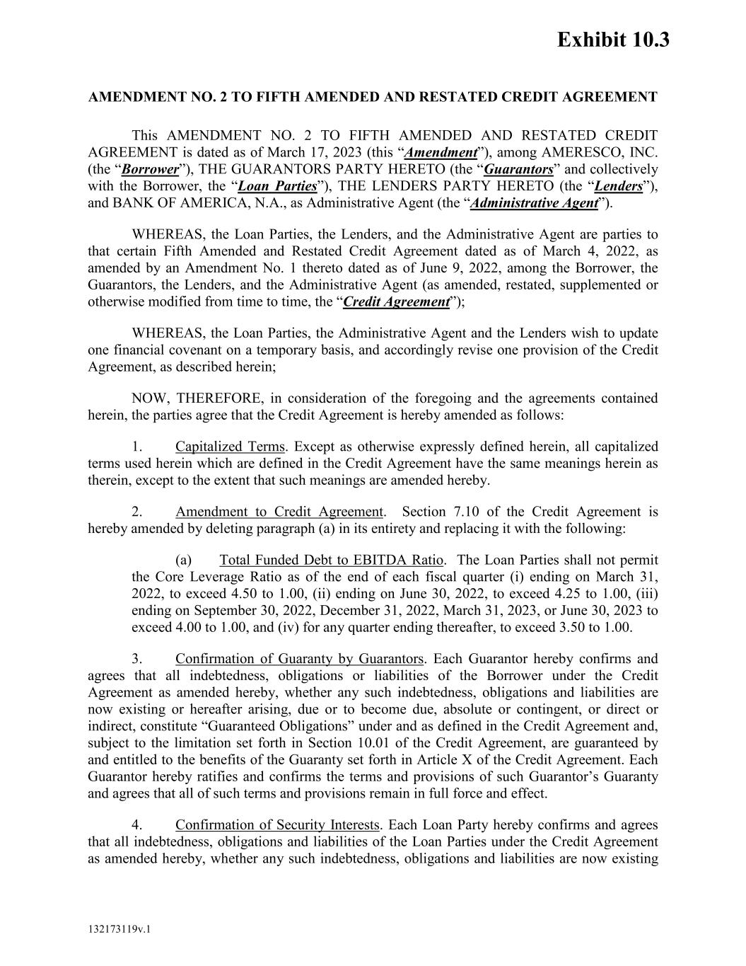 AMENDMENT NO. 2 TO FIFTH AMENDED AND RESTATED CREDIT AGREEMENT This AMENDMENT NO. 2 TO FIFTH AMENDED AND RESTATED CREDIT AGREEMENT is dated as of March 17, 2023 (this “Amendment”), among AMERESCO, INC. (the “Borrower”), THE GUARANTORS PARTY HERETO (the “Guarantors” and collectively with the Borrower, the “Loan Parties”), THE LENDERS PARTY HERETO (the “Lenders”), and BANK OF AMERICA, N.A., as Administrative Agent (the “Administrative Agent”). WHEREAS, the Loan Parties, the Lenders, and the Administrative Agent are parties to that certain Fifth Amended and Restated Credit Agreement dated as of March 4, 2022, as amended by an Amendment No. 1 thereto dated as of June 9, 2022, among the Borrower, the Guarantors, the Lenders, and the Administrative Agent (as amended, restated, supplemented or otherwise modified from time to time, the “Credit Agreement”); WHEREAS, the Loan Parties, the Administrative Agent and the Lenders wish to update one financial covenant on a temporary basis, and accordingly revise one provision of the Credit Agreement, as described herein; NOW, THEREFORE, in consideration of the foregoing and the agreements contained herein, the parties agree that the Credit Agreement is hereby amended as follows: 1. Capitalized Terms. Except as otherwise expressly defined herein, all capitalized terms used herein which are defined in the Credit Agreement have the same meanings herein as therein, except to the extent that such meanings are amended hereby. 2. Amendment to Credit Agreement. Section 7.10 of the Credit Agreement is hereby amended by deleting paragraph (a) in its entirety and replacing it with the following: (a) Total Funded Debt to EBITDA Ratio. The Loan Parties shall not permit the Core Leverage Ratio as of the end of each fiscal quarter (i) ending on March 31, 2022, to exceed 4.50 to 1.00, (ii) ending on June 30, 2022, to exceed 4.25 to 1.00, (iii) ending on September 30, 2022, December 31, 2022, March 31, 2023, or June 30, 2023 to exceed 4.00 to 1.00, and (iv) for any quarter ending thereafter, to exceed 3.50 to 1.00. 3. Confirmation of Guaranty by Guarantors. Each Guarantor hereby confirms and agrees that all indebtedness, obligations or liabilities of the Borrower under the Credit Agreement as amended hereby, whether any such indebtedness, obligations and liabilities are now existing or hereafter arising, due or to become due, absolute or contingent, or direct or indirect, constitute “Guaranteed Obligations” under and as defined in the Credit Agreement and, subject to the limitation set forth in Section 10.01 of the Credit Agreement, are guaranteed by and entitled to the benefits of the Guaranty set forth in Article X of the Credit Agreement. Each Guarantor hereby ratifies and confirms the terms and provisions of such Guarantor’s Guaranty and agrees that all of such terms and provisions remain in full force and effect. 4. Confirmation of Security Interests. Each Loan Party hereby confirms and agrees that all indebtedness, obligations and liabilities of the Loan Parties under the Credit Agreement as amended hereby, whether any such indebtedness, obligations and liabilities are now existing 132173119v.1 Exhibit 10.3
