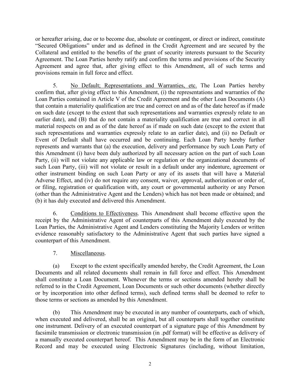 2 or hereafter arising, due or to become due, absolute or contingent, or direct or indirect, constitute “Secured Obligations” under and as defined in the Credit Agreement and are secured by the Collateral and entitled to the benefits of the grant of security interests pursuant to the Security Agreement. The Loan Parties hereby ratify and confirm the terms and provisions of the Security Agreement and agree that, after giving effect to this Amendment, all of such terms and provisions remain in full force and effect. 5. No Default; Representations and Warranties, etc. The Loan Parties hereby confirm that, after giving effect to this Amendment, (i) the representations and warranties of the Loan Parties contained in Article V of the Credit Agreement and the other Loan Documents (A) that contain a materiality qualification are true and correct on and as of the date hereof as if made on such date (except to the extent that such representations and warranties expressly relate to an earlier date), and (B) that do not contain a materiality qualification are true and correct in all material respects on and as of the date hereof as if made on such date (except to the extent that such representations and warranties expressly relate to an earlier date), and (ii) no Default or Event of Default shall have occurred and be continuing. Each Loan Party hereby further represents and warrants that (a) the execution, delivery and performance by such Loan Party of this Amendment (i) have been duly authorized by all necessary action on the part of such Loan Party, (ii) will not violate any applicable law or regulation or the organizational documents of such Loan Party, (iii) will not violate or result in a default under any indenture, agreement or other instrument binding on such Loan Party or any of its assets that will have a Material Adverse Effect, and (iv) do not require any consent, waiver, approval, authorization or order of, or filing, registration or qualification with, any court or governmental authority or any Person (other than the Administrative Agent and the Lenders) which has not been made or obtained; and (b) it has duly executed and delivered this Amendment. 6. Conditions to Effectiveness. This Amendment shall become effective upon the receipt by the Administrative Agent of counterparts of this Amendment duly executed by the Loan Parties, the Administrative Agent and Lenders constituting the Majority Lenders or written evidence reasonably satisfactory to the Administrative Agent that such parties have signed a counterpart of this Amendment. 7. Miscellaneous. (a) Except to the extent specifically amended hereby, the Credit Agreement, the Loan Documents and all related documents shall remain in full force and effect. This Amendment shall constitute a Loan Document. Whenever the terms or sections amended hereby shall be referred to in the Credit Agreement, Loan Documents or such other documents (whether directly or by incorporation into other defined terms), such defined terms shall be deemed to refer to those terms or sections as amended by this Amendment. (b) This Amendment may be executed in any number of counterparts, each of which, when executed and delivered, shall be an original, but all counterparts shall together constitute one instrument. Delivery of an executed counterpart of a signature page of this Amendment by facsimile transmission or electronic transmission (in .pdf format) will be effective as delivery of a manually executed counterpart hereof. This Amendment may be in the form of an Electronic Record and may be executed using Electronic Signatures (including, without limitation,